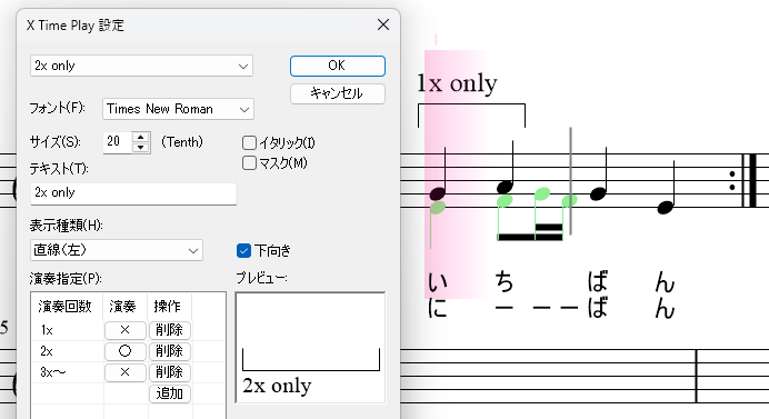 プラチナムではX Time Playを使うことで、1番と2番でフレーズが異なる楽譜も作成できます