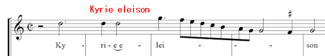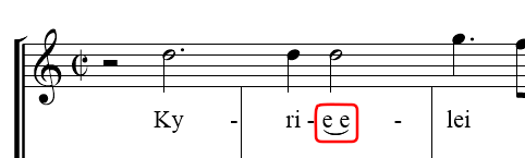 この曲の最初の歌詞は、”Kyrie eleison”ですが、Kyrieの末尾のeと、eleisonの先頭のeが一つの音符に割り当てられています。