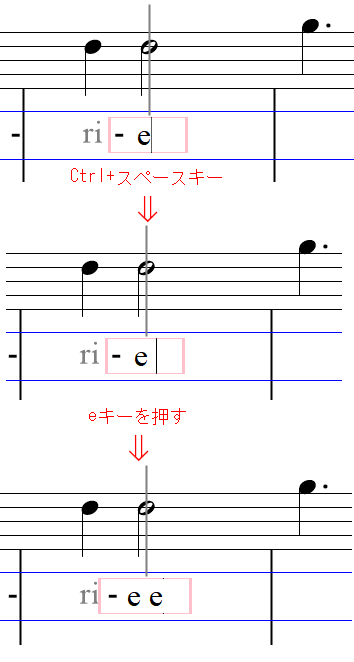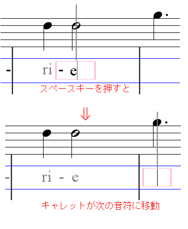 これを入力する場合、eを押してからスペースキーを押すと次の音符にキャレットが移動してしまいうまくいきません