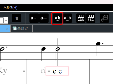 音節を弧線で結ぶには、歌詞入力コントロールバーの「弧線1」ボタンをクリックするか、