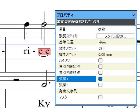歌詞音節のプロパティで「弧線1」にチェックを入れてくださいネ