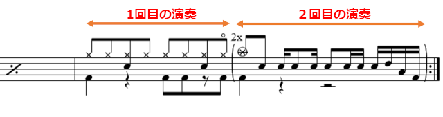 ロック系のバンドスコアでよく見かける、1回目と2回目の演奏を横に並べて表示しているアレのことを、スコメでは横並びX Time Playと表現しています。