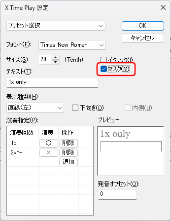1回目のみ演奏するので、設定はこのままでOKです。1回目の表示は省略されることが多いので、「マスク」にチェックを入れておきます。