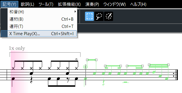 1回目に演奏する記号を選択して、「記号」メニュー「X Time Play」を選択します。