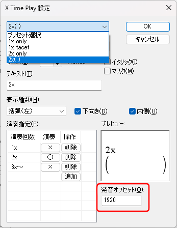 2回目に演奏する記号を選択して、同様に「X Time Play」を選択します。