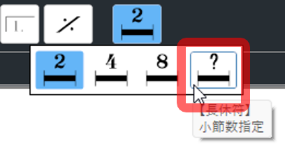 拍子記号と同様に、コントロールバーで「長休符」を選び、[?]の項目を選択します。